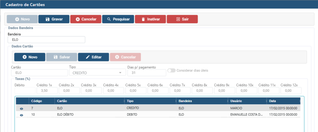 Após definir a bandeira, será possível cadastrar ou editar os cartões vinculados a ela.