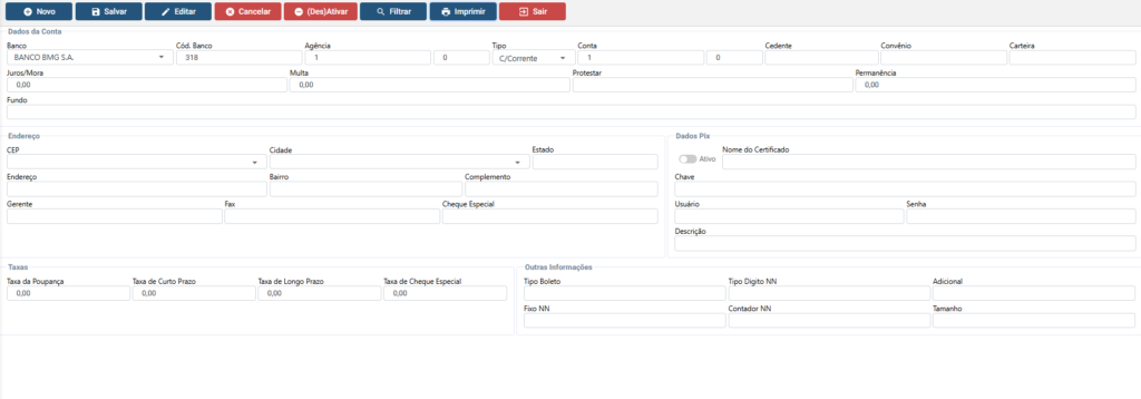 A rotina de Cadastro de Contas Bancárias permite registrar as contas utilizadas pela empresa para operações financeiras, como: