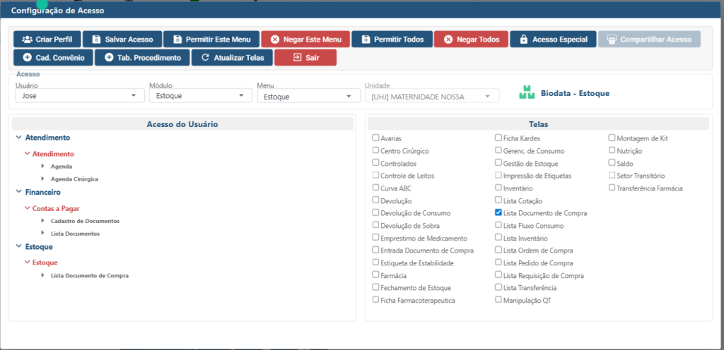 A rotina de Configuração de Acessos permite definir exatamente quais módulos, menus e telas cada usuário poderá utilizar dentro do Biodata Web.